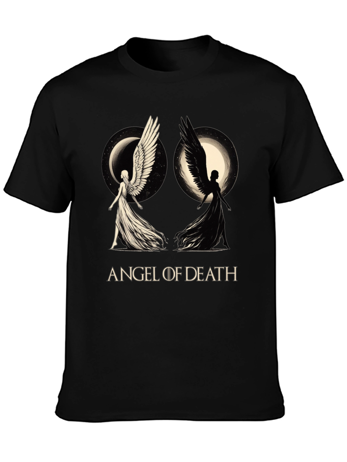 Embrace the duality of light and darkness with this striking Angel of Death graphic t-shirt. This black tee features a unique design showcasing two angel figures, one in pristine white against a crescent moon, and the other in stark black, set against a full moon backdrop. The words "ANGEL OF DEATH" are written in a vintage font beneath the image. Crafted from comfortable, breathable fabric, this tee is perfect for expressing your individuality. Whether you're a fan of gothic aesthetics or simply appreciate symbolic art, this tee makes a bold statement. Stand out from the crowd and make a statement with this tee!